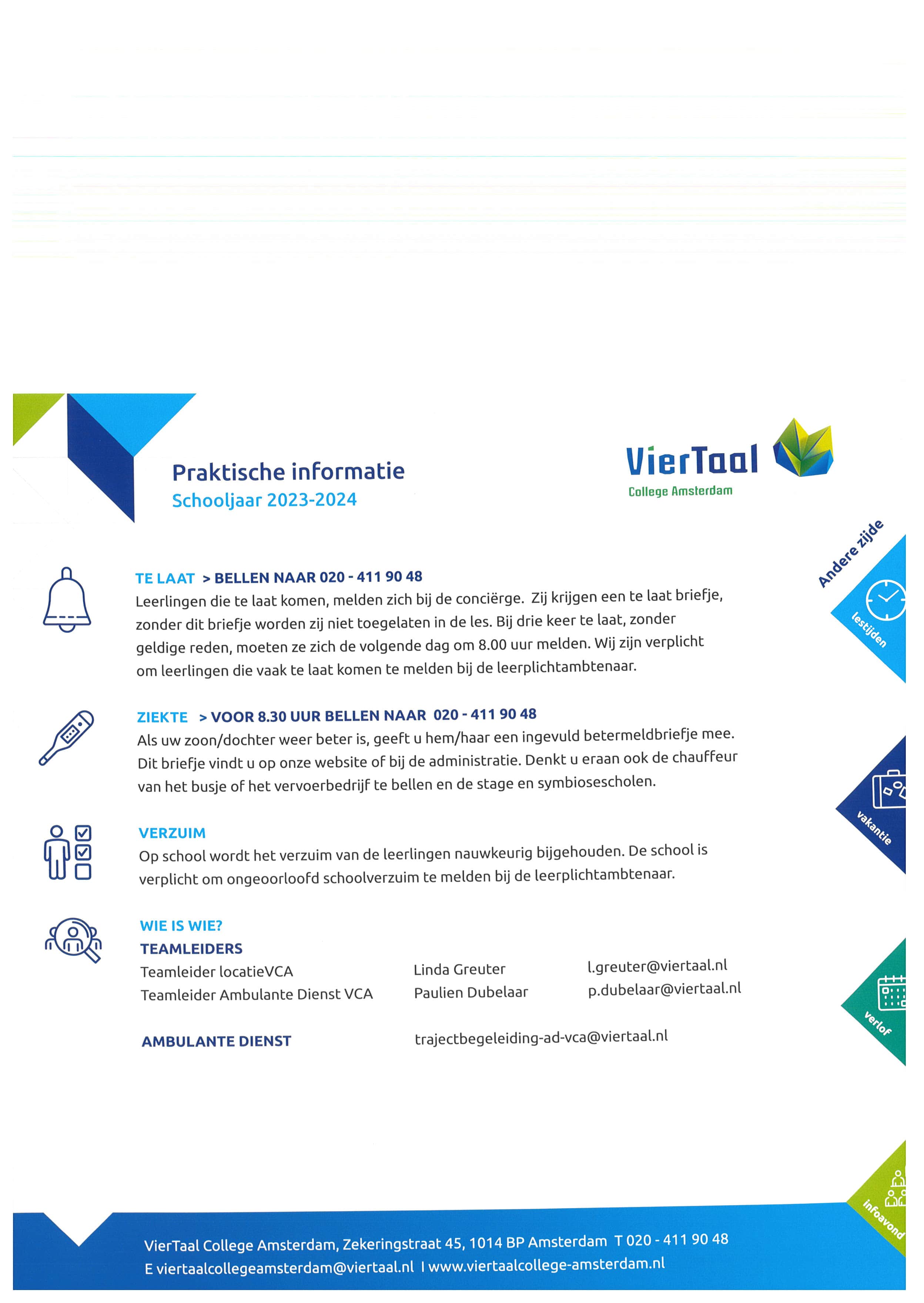 Praktische informatie voor u als ouder over de gang van zaken in school leest u hier. Heeft u er nog meer vragen, mag u zich altijd richten tot de mentor of u belt naar onze administratie.